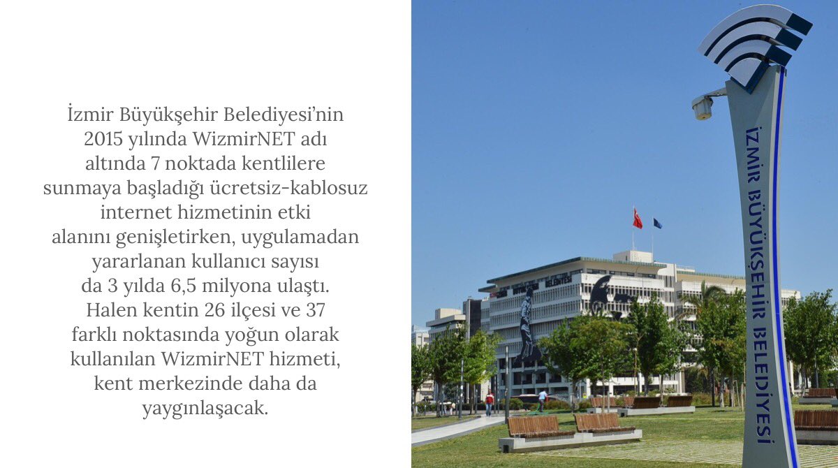 Bugra Gokce A Twitter Bilgiye Dunyaya Erisimi Kolaylastirmak Icin 7noktada Baslattigimiz Ucretsiz Wizmirnet Kablosuz Internet Agini Ilcelere De Yayarak 37 Farkli Noktaya Ulastirdik Wizmirnet Ile 3yilda 6 5milyon Kullanici Ucretsiz Kablosuz Ag